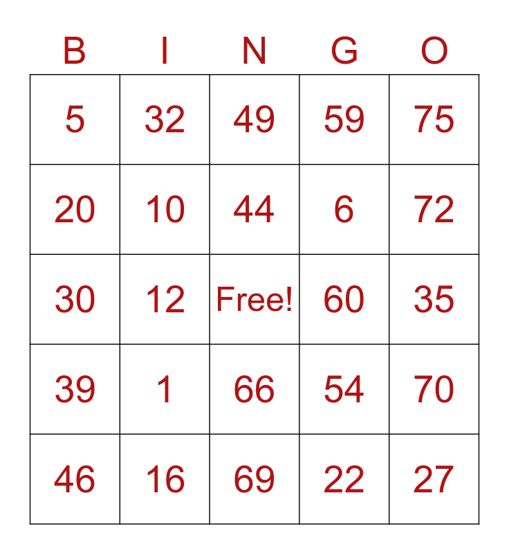 This bingo card has a free space and 24 words: 1, 16, 44, 46, 75, 5, 20, 32, 60, 66, 6, 30, 54, 70, 10, 22, 35, 49, 72, 12, 27, 39, 59 and 69.