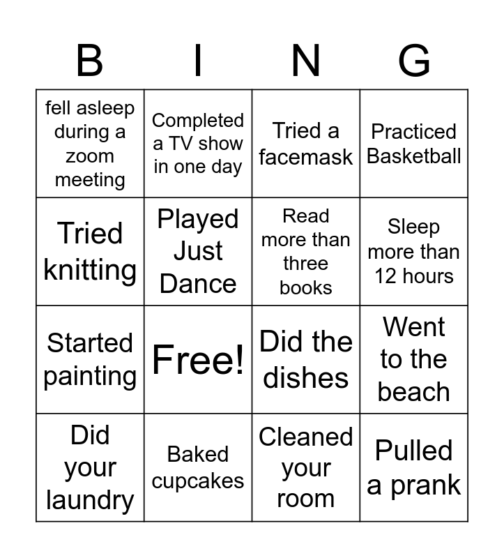 This bingo card has 16 words: Baked cupcakes, Went to the beach, Tried a facemask, fell asleep during a zoom meeting, Started painting, Completed a TV show in one day, Did the dishes, Cleaned your room, Tried knitting, Played Just Dance, Did your laundry, Practiced Basketball, Free!, Sleep more than 12 hours, Read more than three books and Pulled a prank.