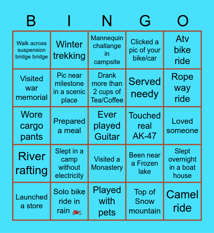 This bingo card has 25 words: River rafting, Solo bike ride in rain 🏍️, Ever played Guitar, Top of Snow mountain, Atv bike ride, Walk across suspension bridge bridge, Winter trekking, Mannequin challange in campsite, Touched real AK-47, Slept overnight in a boat house, Visited war memorial, Pic near milestone in a scenic place, Played with pets, Been near a Frozen lake, Rope way ride, Launched a store, Prepared a meal, Drank more than 2 cups of Tea/Coffee, Served needy, Loved someone, Wore cargo pants, Slept in a camp without electricity, Visited a Monastery, Clicked a pic of your bike/car and Camel ride.