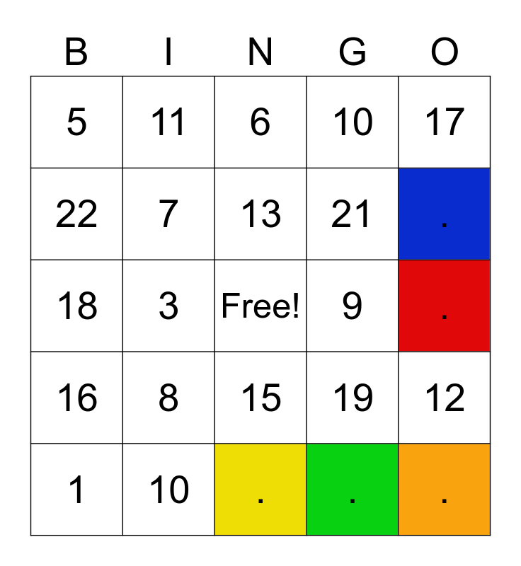 This bingo card has a free space and 29 words: 1, 2, 3, 4, 5, 6, 7, 8, 9, 10, ., ., ., ., ., ., 15, 16, 17, 18, 19, 20, 21, 22, 10, 11, 12, 13 and 14.