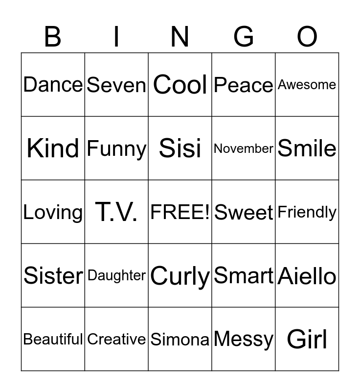 This bingo card has a free space and 24 words: Daughter, Creative, Sisi, Beautiful, Awesome, Dance, Kind, Seven, Sweet, Curly, November, Loving, Smart, Aiello, Funny, Messy, Friendly, Cool, Smile, T.V., Girl, Sister, Peace and Simona.