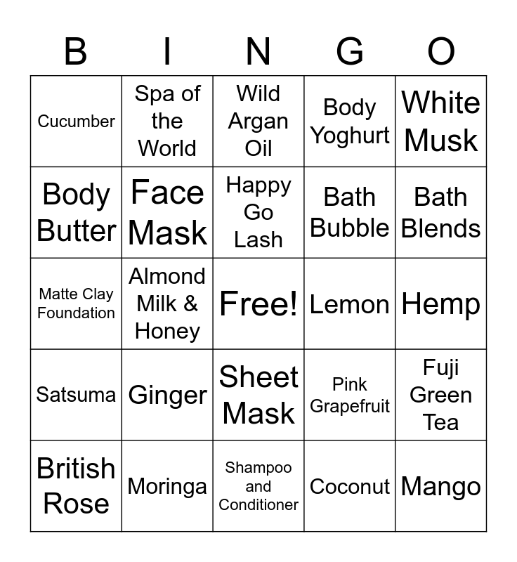 This bingo card has a free space and 35 words: Roots of Strengh, Oils of Life, Drops of Youth, Face Mask, Sheet Mask, Body Yoghurt, Body Butter, Body Scrub, Happy Go Lash, Lash Hero Mascara, Matte Clay Foundation, White Musk, Black Musk, Shea, Cucumber, Lemon, Coconut, Almond Milk & Honey, Satsuma, Mango, Pink Grapefruit, British Rose, Fuji Green Tea, Moringa, Wild Argan Oil, Bath Blends, Hand Cream, Hand Cleansers, Bath Bubble, Hemp, Peppermint, Shampoo and Conditioner, Ginger, Spa of the World and Tea Tree.