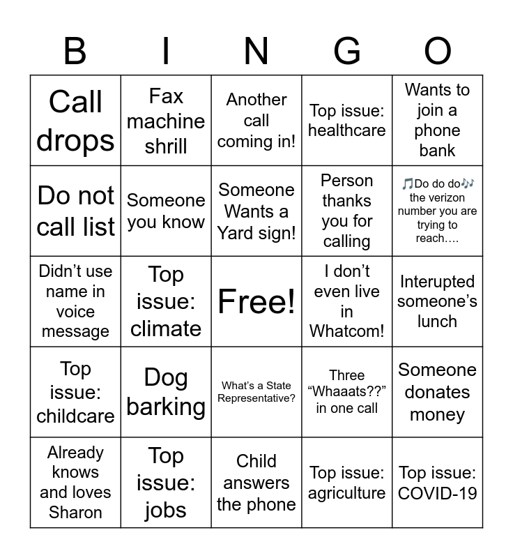 This bingo card has a free space and 25 words: Dog barking, Child answers the phone, Someone Wants a Yard sign!, Already knows and loves Sharon, Wants to join a phone bank, Call drops, Do not call list, Fax machine shrill, I don’t even live in Whatcom!, What’s a State Representative?, Person thanks you for calling, Didn’t use name in voice message, Three “Whaaats??” in one call, Someone donates money, Someone you know, Sharon’s student, Interupted someone’s lunch, Another call coming in!, 🎵Do do do🎶 the verizon number you are trying to reach…., Top issue: climate, Top issue: COVID-19, Top issue: jobs, Top issue: childcare, Top issue: healthcare and Top issue: agriculture.
