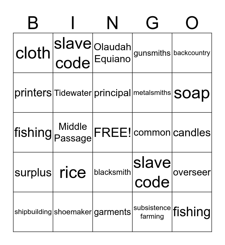 This bingo card has a free space and 32 words: subsistence farming, triangular trade, Middle Passage, cash crop, surplus, Tidewater, backcountry, overseer, slave code, rely, principal, Olaudah Equiano, Philadelphia, Pennsylvania, immigration, common, tobacco, shipbuilding, fishing, blacksmith, rice, slave code, mills, candles, shoemaker, fishing, gunsmiths, metalsmiths, printers, cloth, garments, candles and soap.