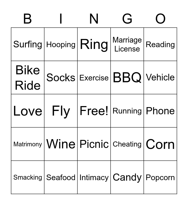 This bingo card has a free space and 24 words: Wine, Seafood, Exercise, Smacking, Reading, Surfing, Bike Ride, Hooping, Running, Picnic, BBQ, Love, Cheating, Corn, Socks, Candy, Phone, Ring, Vehicle, Fly, Popcorn, Matrimony, Marriage License and Intimacy.