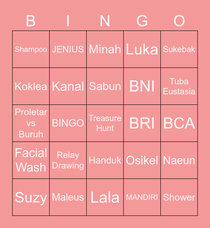 This bingo card has 25 words: Relay Drawing, Lala, Sabun, Suzy, Sukebak, Shampoo, Koklea, JENIUS, BRI, Handuk, BNI, Proletar vs Buruh, Osikel, Naeun, Kanal, Shower, BCA, Minah, Tuba Eustasia, BINGO, Treasure Hunt, Maleus, Facial Wash, Luka and MANDIRI.