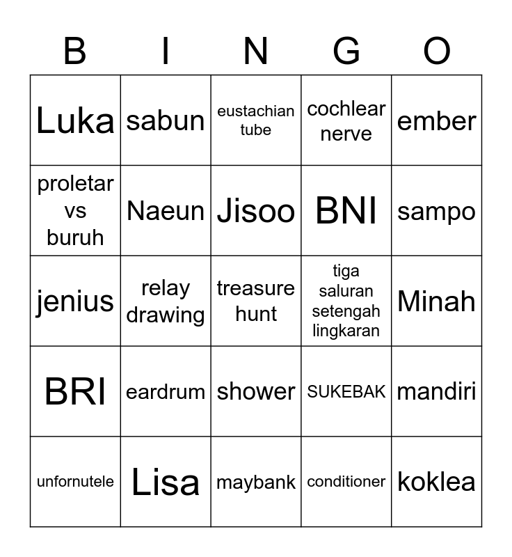 This bingo card has 25 words: eardrum, maybank, Jisoo, unfornutele, ember, Luka, proletar vs buruh, sabun, tiga saluran setengah lingkaran, shower, BNI, jenius, SUKEBAK, mandiri, Naeun, koklea, Minah, eustachian tube, sampo, relay drawing, treasure hunt, Lisa, BRI, cochlear nerve and conditioner.