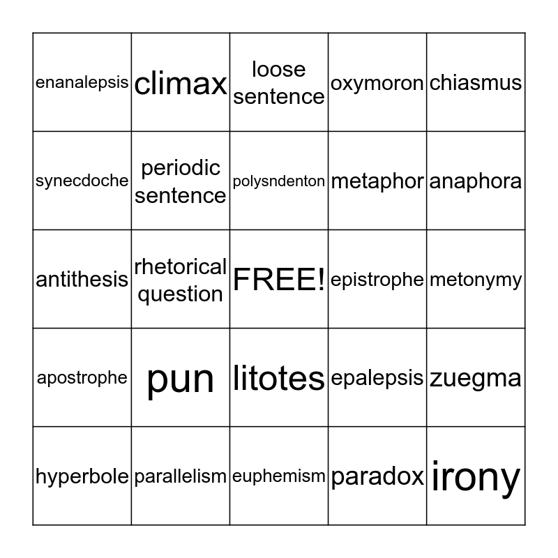 This bingo card has a free space and 24 words: pun, parallelism, polysndenton, hyperbole, chiasmus, enanalepsis, synecdoche, climax, epistrophe, litotes, metaphor, antithesis, epalepsis, zuegma, periodic sentence, paradox, metonymy, loose sentence, anaphora, rhetorical question, irony, apostrophe, oxymoron and euphemism.