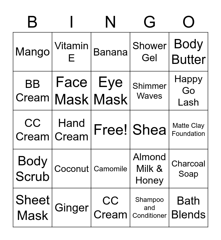 This bingo card has a free space and 39 words: Roots of Strength, Oils of Life, Drops of Youth, Face Mask, Sheet Mask, Camomile, Eye Mask, Body Yoghurts, Body Butter, Body Scrub, Hand Cream, Shower Gel, Bath Blends, Matte Clay Foundation, Shea, Coconut, Satsuma, Mango, Fuji Green Tea, Almond Milk & Honey, BB Cream, CC Cream, Shimmer Waves, Happy Go Lash, Fibre Lash Mascara, Mens, Drops of Light, Skin Defence, Vitamin C, Vitamin E, Aloe, Seaweed, Banana, Ginger, Shampoo and Conditioner, Strawberry, Charcoal Soap, CC Cream and BB Cream.