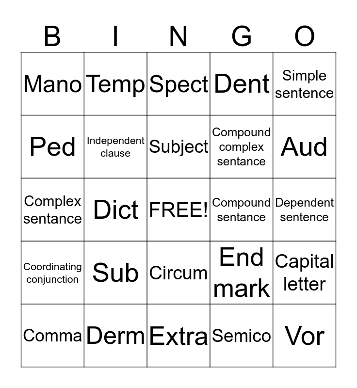 This bingo card has a free space and 24 words: Sub, Derm, Subject, Comma, Simple sentence, Mano, Ped, Temp, Compound sentance, Circum, Compound complex sentance, Complex sentance, End mark, Capital letter, Independent clause, Semico, Dependent sentence, Spect, Aud, Dict, Vor, Coordinating conjunction, Dent and Extra.