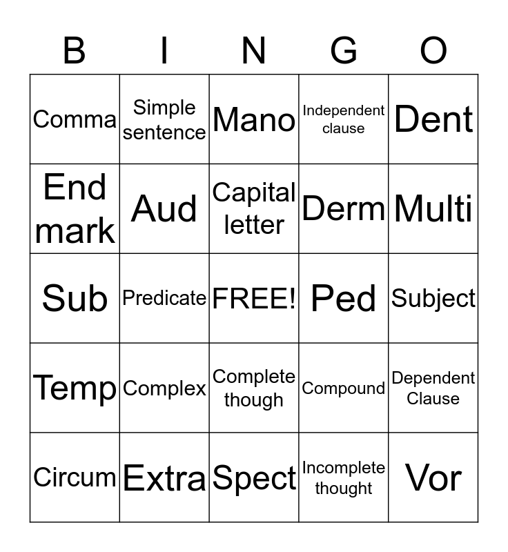 This bingo card has a free space and 24 words: Complex, Extra, Capital letter, Circum, Dent, Comma, End mark, Simple sentence, Ped, Complete though, Derm, Sub, Compound, Dependent Clause, Aud, Incomplete thought, Subject, Mano, Multi, Predicate, Vor, Temp, Independent clause and Spect.