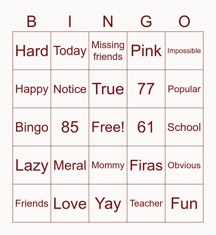 This bingo card has a free space and 24 words: Meral, Love, True, Friends, Impossible, Hard, Happy, Today, 61, Mommy, 77, Bingo, Firas, Obvious, Notice, Teacher, School, Missing friends, Popular, 85, Fun, Lazy, Pink and Yay.