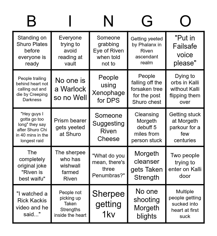 This bingo card has a free space and 24 words: The sherpee who has wishwall farmed Riven, People not picking up Taken Strengths inside the heart, People using Xenophage for DPS, "I watched a Rick Kackis video and he said...", "Put in Failsafe voice please", Standing on Shuro Plates before everyone is ready, People trailing behind heart not calling out and die by Creeping Darkness, Everyone trying to avoid reading at vault, Cleansing Morgeth debuff 5 miles from person stuck, "What do you mean, there's three Penumbras?", People falling off the forsaken tree for the post Shuro chest, "Hey guys I gotta go too long" they say after Shuro Chi in 40 mins in the longest raid, Morgeth cleanser gets Taken Strength, Two people trying to enter on Kalli door, No one is a Warlock so no Well, No one shooting Morgeth blights, Getting stuck at Morgeth parkour for a few centuries, Someone grabbing Eye of Riven when told not to, Dying to orbs in Kalli without Kalli flipping them over, Prism bearer gets yeeted at Shuro, Multiple people getting sucked into heart at first suck, The completely original joke "Riven is best waifu", Getting yeeted by Phalanx in Riven ascendant realm and Sherpee getting 1kv.