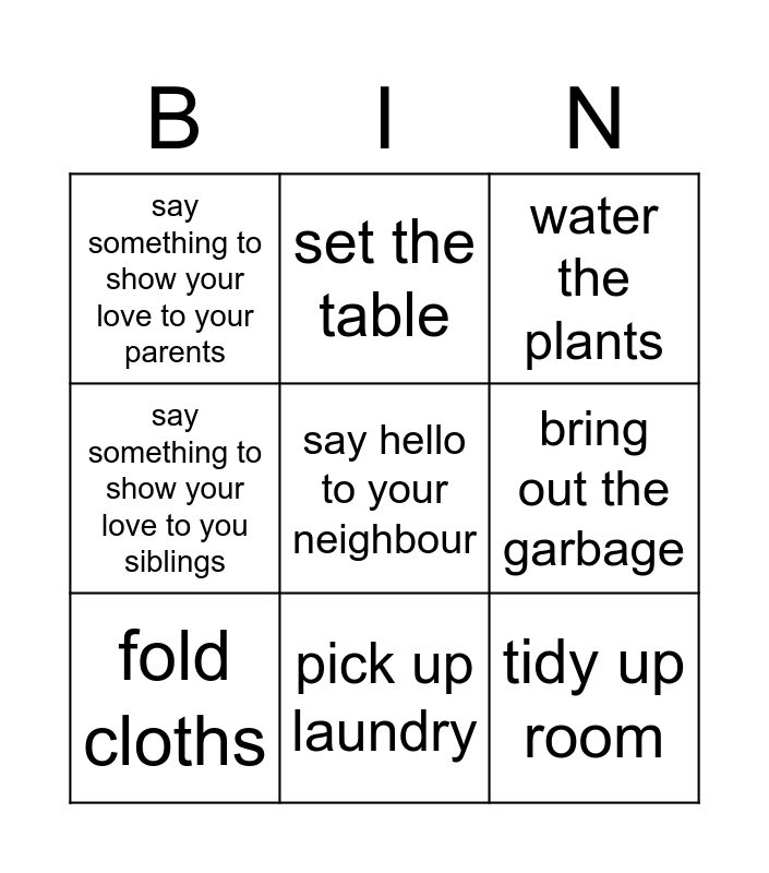 This bingo card has 12 words: make coffee for a family member, tidy up room, say hello to your neighbour, bring out the garbage, set the table, water the plants, pick up laundry, sweep the floor, say something to show your love to your parents, say something to show your love to you siblings, fold cloths and wash the dishes.