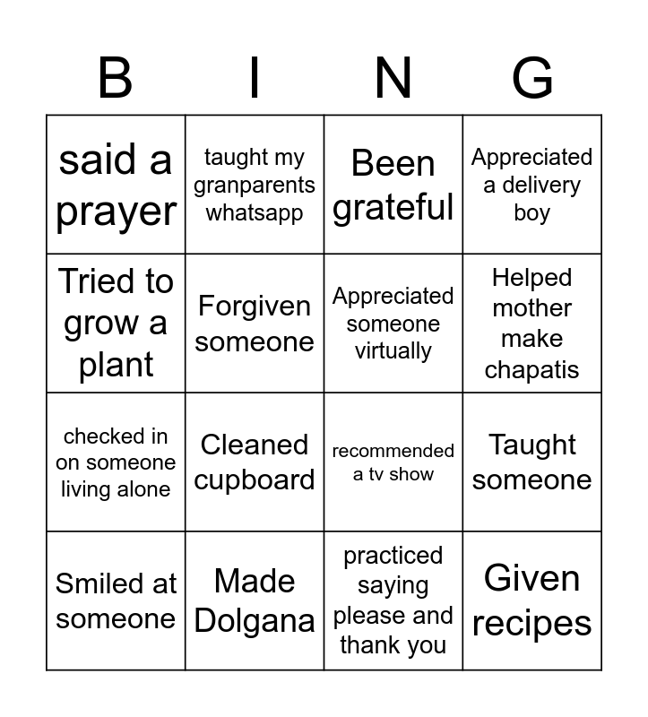 This bingo card has 16 words: Made Dolgana, Taught someone, Been grateful, said a prayer, checked in on someone living alone, taught my granparents whatsapp, recommended a tv show, practiced saying please and thank you, Tried to grow a plant, Forgiven someone, Smiled at someone, Appreciated a delivery boy, Cleaned cupboard, Helped mother make chapatis, Appreciated someone virtually and Given recipes.