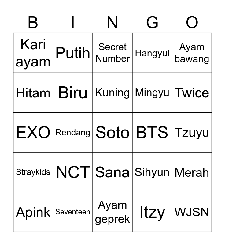 This bingo card has a free space and 24 words: NCT, Seventeen, Kuning, Apink, Ayam bawang, Kari ayam, Hitam, Putih, BTS, Sana, Mingyu, EXO, Sihyun, Merah, Biru, Itzy, Tzuyu, Secret Number, Twice, Rendang, WJSN, Straykids, Hangyul and Ayam geprek.