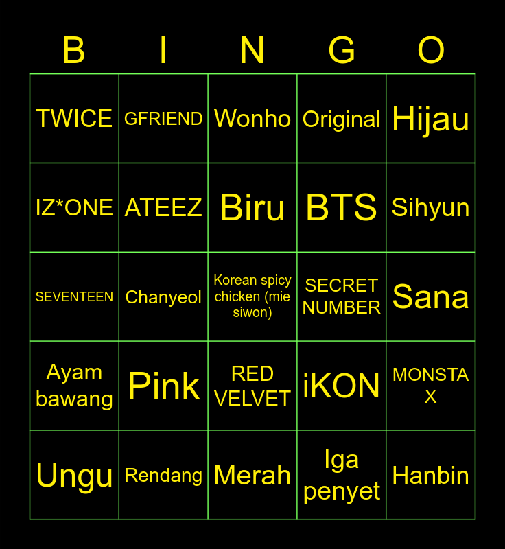 This bingo card has 25 words: Pink, Merah, Biru, Ungu, Hijau, TWICE, IZ*ONE, GFRIEND, SECRET NUMBER, RED VELVET, BTS, SEVENTEEN, iKON, MONSTA X, ATEEZ, Hanbin, Sana, Wonho, Sihyun, Chanyeol, Korean spicy chicken (mie siwon), Rendang, Ayam bawang, Original and Iga penyet.
