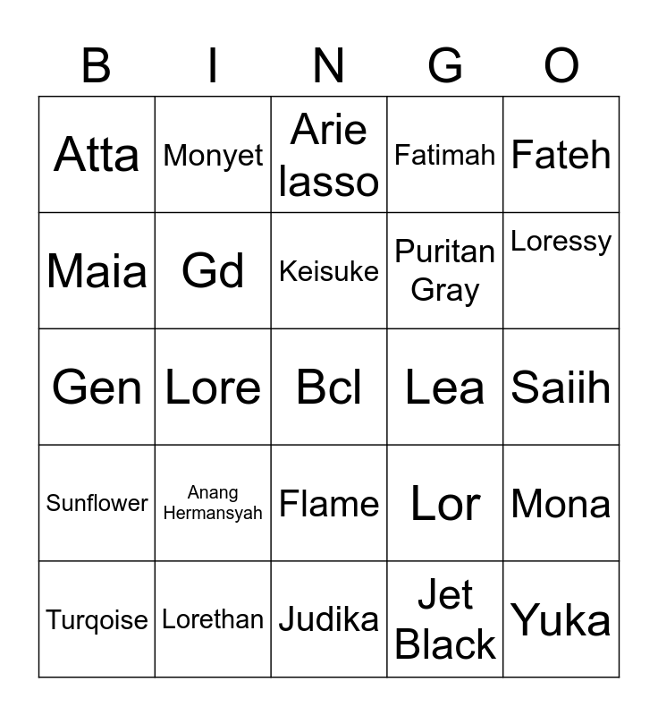 This bingo card has a free space and 24 words: Anang Hermansyah, Lorethan, Keisuke, Turqoise, Fateh, Atta, Maia, Monyet, Lea, Flame, Puritan Gray, Gen, Lor, Mona, Gd, Jet Black, Saiih, Arie lasso, Loressy, Lore, Yuka, Sunflower, Fatimah and Judika.