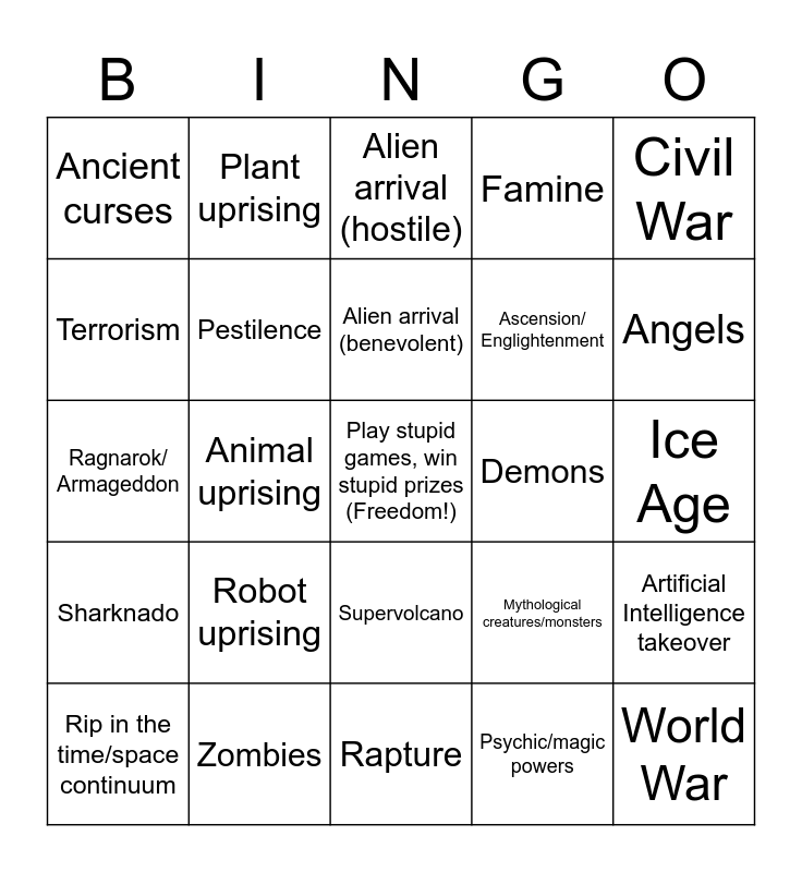 This bingo card has a free space and 24 words: Robot uprising, Zombies, Alien arrival (benevolent), Rip in the time/space continuum, Civil War, Ancient curses, Terrorism, Plant uprising, Demons, Supervolcano, Ascension/ Englightenment, Ragnarok/ Armageddon, Mythological creatures/monsters, Artificial Intelligence takeover, Pestilence, Psychic/magic powers, Ice Age, Alien arrival (hostile), Angels, Animal uprising, World War, Sharknado, Famine and Rapture.