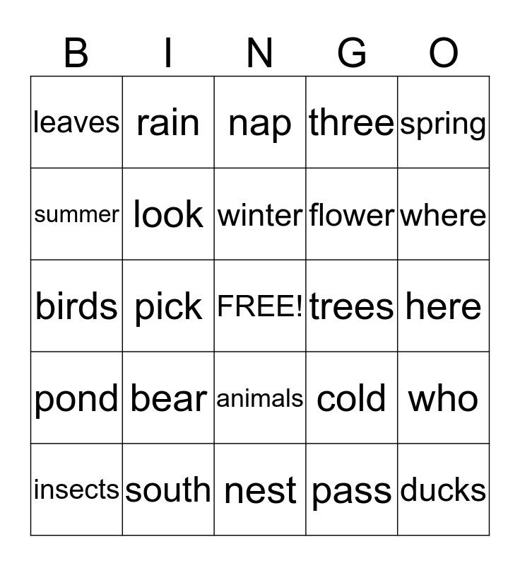 This bingo card has a free space and 24 words: bear, south, winter, insects, spring, leaves, summer, rain, trees, animals, flower, birds, cold, who, look, pass, here, nap, where, pick, ducks, pond, three and nest.