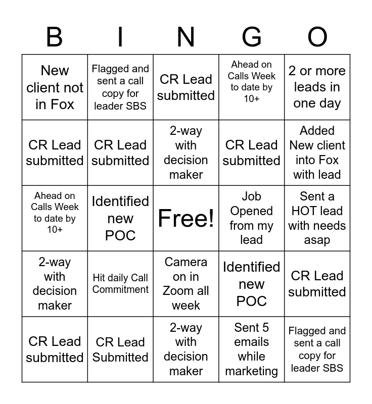 This bingo card has a free space and 24 words: CR Lead submitted, Hit daily Call Commitment, 2-way with decision maker, Sent 5 emails while marketing, 2 or more leads in one day, New client not in Fox, Flagged and sent a call copy for leader SBS, CR Lead submitted, Job Opened from my lead, Sent a HOT lead with needs asap, Ahead on Calls Week to date by 10+, CR Lead submitted, Identified new POC, CR Lead submitted, CR Lead submitted, CR Lead Submitted, 2-way with decision maker, Ahead on Calls Week to date by 10+, Added New client into Fox with lead, 2-way with decision maker, Identified new POC, Camera on in Zoom all week, CR Lead submitted and Flagged and sent a call copy for leader SBS.