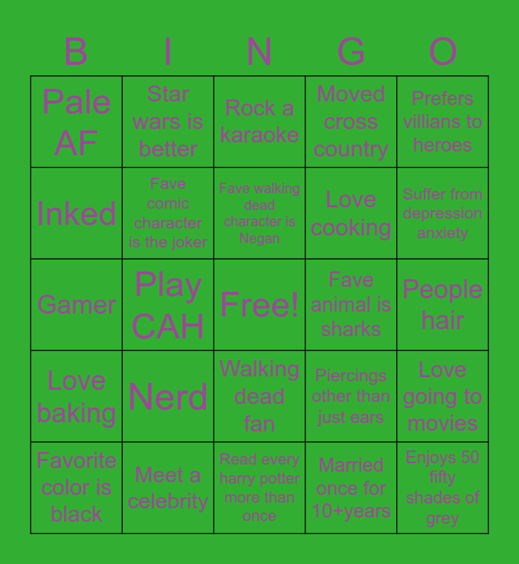 This bingo card has a free space and 24 words: Nerd, Meet a celebrity, Fave walking dead character is Negan, Favorite color is black, Prefers villians to heroes, Pale AF, Inked, Star wars is better, Fave animal is sharks, Walking dead fan, Love cooking, Gamer, Piercings other than just ears, Love going to movies, Fave comic character is the joker, Married once for 10+years, People hair, Rock a karaoke, Suffer from depression anxiety, Play CAH, Enjoys 50 fifty shades of grey, Love baking, Moved cross country and Read every harry potter more than once.