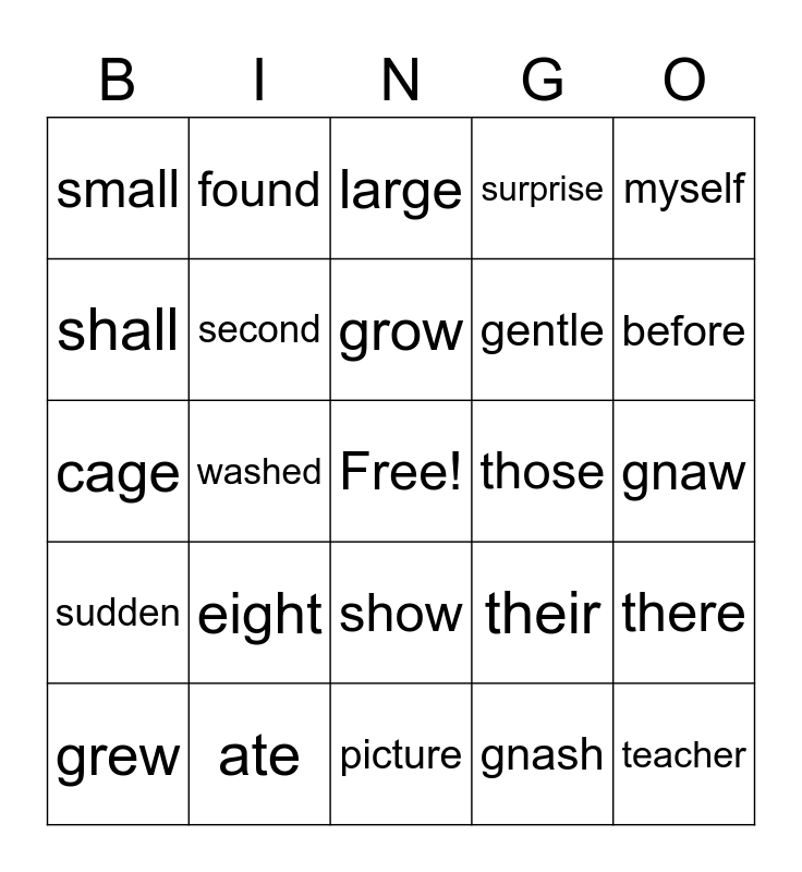 This bingo card has a free space and 24 words: eight, ate, grow, grew, myself, small, shall, found, those, show, gentle, cage, their, there, second, gnash, gnaw, large, before, washed, teacher, sudden, surprise and picture.