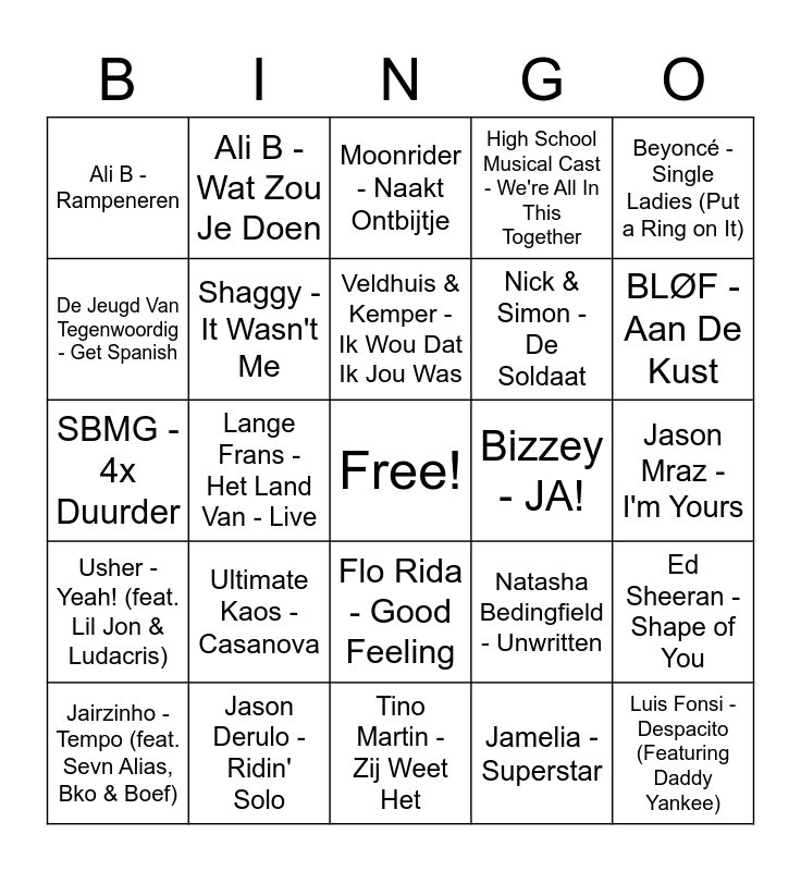 This bingo card has a free space and 66 words: Brainpower - Vlinders, Jamai - Step Right Up, Tess - Stupid, Ed Sheeran - Shape of You, Ronnie Flex - Energie, Andy Grammer - Fresh Eyes, Ali B - Wat Zou Je Doen, Yes-R - Uit Elkaar, Veldhuis & Kemper - Ik Wou Dat Ik Jou Was, The Partysquad - Rampeneren, Flo Rida - Good Feeling, The Him - Feels Like Home - Radio Edit, Jason Mraz - I'm Yours, Beyoncé - Single Ladies (Put a Ring on It), Jeroen Van Der Boom - Jij Bent Zo, De Jeugd Van Tegenwoordig - Get Spanish, Lange Frans - Het Land Van - Live, Ali B - Rampeneren, Mr. Polska - Ravotten - Original Mix, Nick & Simon - De Soldaat, Ultimate Kaos - Casanova, Usher - Yeah! (feat. Lil Jon & Ludacris), High School Musical Cast - We're All In This Together, Taio Cruz - Dynamite, De Jeugd Van Tegenwoordig - Sterrenstof, B.o.B - Airplanes (feat. Hayley Williams), Backstreet Boys - Everybody (Backstreet's Back) - Radio Edit, Jebroer - Kind Van De Duivel, Luis Fonsi - Despacito (Featuring Daddy Yankee), Martin Garrix - Scared to Be Lonely, Jairzinho - Tempo (feat. Sevn Alias, Bko & Boef), Spice Girls – Wannabe, ABBA – Dancing Queen, Ed Sheeran - Galway Girl, Natasha Bedingfield - Unwritten, Jason Derulo - Ridin' Solo, Lil Kleine - Krantenwijk, SBMG - 4x Duurder, Jamelia - Superstar, Brainpower - Dansplaat, Shaggy - It Wasn't Me, BLØF - Zoutelande, Bizzey - JA!, Puri - Coño, Crystal Fighters - Plage, Dua Lipa - IDGAF, BLØF - Aan De Kust, Justin Bieber - One Time (My Heart Edition), Ronnie Flex - Omarm Me, Destiny's Child - Say My Name, Linda Roos & Jessica - Ademnood, Zanger Kafke - Springen, Lady Gaga - Shallow, Kav Verhouzer - Stap Voor Stap, Rob De Nijs - Banger Hart - Radio Mix, Kris Kross Amsterdam - Hij Is Van Mij (feat. Bizzey), Suzan & Freek - Als Het Avond Is, Swifty Official - Dakterras, Moonrider - Naakt Ontbijtje, Tino Martin - Zij Weet Het, Dance Monkey – Tones and I, Supalonely – BENEE, Hou je bek en bef me – MEROL, Reünie – Snelle, Duurt te lang – Davina Michelle and Vonken & Vuur - Clouseau.