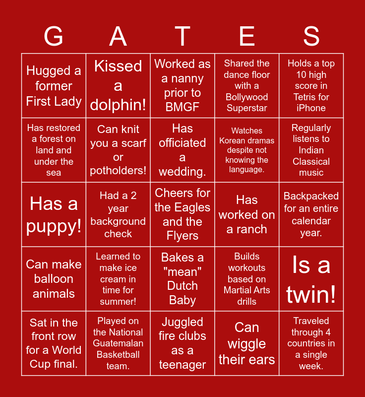 This bingo card has a free space and 35 words: Was a ballerina and martial artist... at the same time., Is a yoga instructor, Dreams of sharing a pint with Bill and Melinda, Can knit you a scarf or potholders!, Bakes a "mean" Dutch Baby, Shared the dance floor with a Bollywood Superstar, Has restored a forest on land and under the sea, Their final exam included sparring in the ring, Has officiated a wedding., Is the sole person on earth with their name., Has a puppy!, Holds a top 10 high score in Tetris for iPhone, Loves to tend to their Garden, Competed in a bodybuilding competition, Hugged a former First Lady, Has worked on a ranch, Can wiggle their ears, Had a 2 year background check, Can make balloon animals, Traveled through 4 countries in a single week., Builds workouts based on Martial Arts drills, Sat in the front row for a World Cup final., Is a twin!, Played on the National Guatemalan Basketball team., Worked as a nanny prior to BMGF, Regularly listens to Indian Classical music, Has a postcard from every place they've traveled to., Dropped frozen beef and broke 2 toes, Watches Korean dramas despite not knowing the language., Backpacked for an entire calendar year., Speaks more than 2 languages, Juggled fire clubs as a teenager, Learned to make ice cream in time for summer!, Kissed a dolphin! and Was Twitter famous..