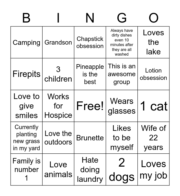 This bingo card has a free space and 24 words: Love the outdoors, Love animals, Pineapple is the best, Family is number 1, Loves the lake, Camping, Firepits, Grandson, Wears glasses, Brunette, This is an awesome group, Love to give smiles, Likes to be myself, Wife of 22 years, 3 children, 2 dogs, 1 cat, Chapstick obsession, Lotion obsession, Works for Hospice, Loves my job, Currently planting new grass in my yard, Always have dirty dishes even 10 minutes after they are all washed and Hate doing laundry.