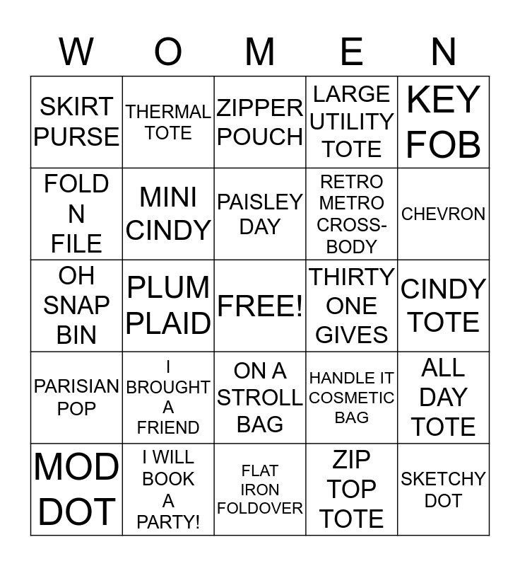 This bingo card has a free space and 24 words: I BROUGHT A FRIEND, I WILL BOOK A PARTY!, PAISLEY DAY, MOD DOT, KEY FOB, SKIRT PURSE, FOLD N FILE, THERMAL TOTE, THIRTY ONE GIVES, ON A STROLL BAG, RETRO METRO CROSS- BODY, OH SNAP BIN, HANDLE IT COSMETIC BAG, ALL DAY TOTE, MINI CINDY, ZIP TOP TOTE, CINDY TOTE, ZIPPER POUCH, CHEVRON, PLUM PLAID, SKETCHY DOT, PARISIAN POP, LARGE UTILITY TOTE and FLAT IRON FOLDOVER.