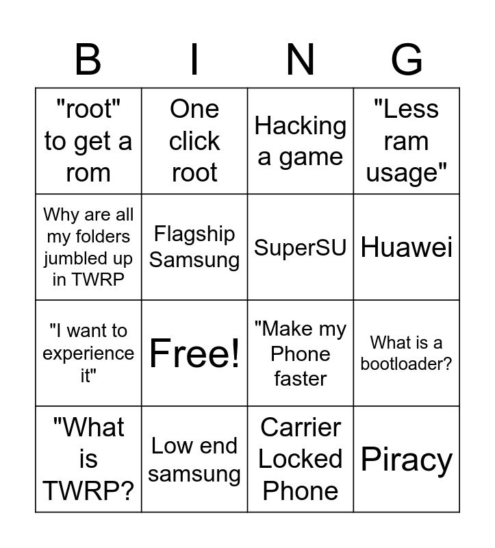 This bingo card has 16 words: Low end samsung, What is a bootloader?, Hacking a game, "root" to get a rom, "I want to experience it", One click root, "Make my Phone faster, Carrier Locked Phone, Why are all my folders jumbled up in TWRP, Flagship Samsung, "What is TWRP?, "Less ram usage", Free!, Huawei, SuperSU and Piracy.