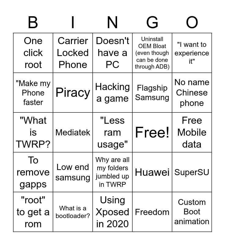 This bingo card has a free space and 24 words: Low end samsung, What is a bootloader?, Hacking a game, "root" to get a rom, "I want to experience it", One click root, "Make my Phone faster, Carrier Locked Phone, Free!, Why are all my folders jumbled up in TWRP, Flagship Samsung, "What is TWRP?, Huawei, SuperSU, Piracy, Freedom, Free Mobile data, Doesn't have a PC, No name Chinese phone, Mediatek, Custom Boot animation, To remove gapps, Uninstall OEM Bloat (even though can be done through ADB) and Using Xposed in 2020.
