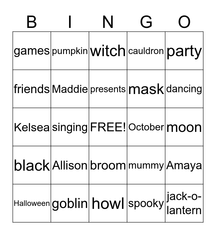 This bingo card has a free space and 54 words: bats, black, bones, boo, broom, candy, cauldron, costume, friends, fun, games, ghost, goblin, Halloween, haunted, howl, jack-o-lantern, mask, monster, moon, mummy, night, October, party, balloons, pumpkin, scary, skeleton, spider, spooky, treat, trick, vampire, web, witch, Kensleigh, Kelsea, Amaya, Keira, Maddie, Bernie, Meadowe, Elijah, Ben, Allison, Kyah, Johanna, birthday party, presents, singing, dancing, celebration, surprise and cake.