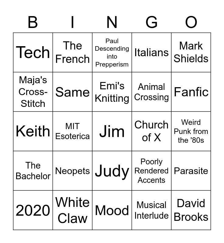 This bingo card has a free space and 29 words: 2020, Twitter Link that Everybody Has To Follow, MIT Esoterica, Thicc, Tech, Paul Descending into Prepperism, Same, Neopets, Church of X, White Claw, Weird Punk from the '80s, David Brooks, Mood, Musical Interlude, Fanfic, Stonks, Judy, The Bachelor, Mark Shields, Keith, Poorly Rendered Accents, Sewing Machines, Animal Crossing, Maja's Cross-Stitch, Italians, The French, Parasite, Emi's Knitting and Silk Face Masks.