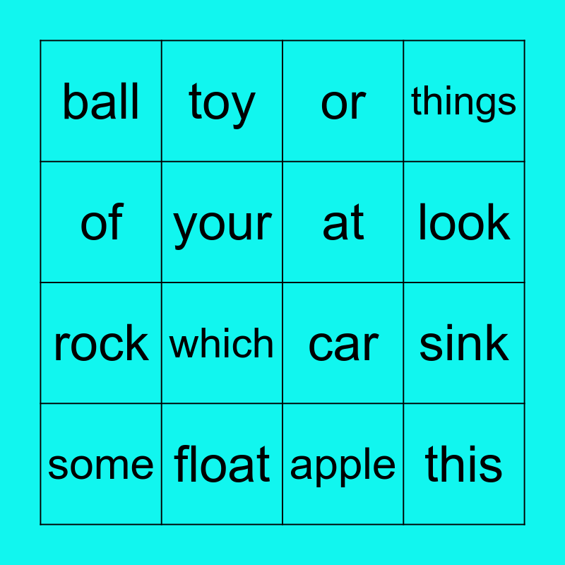 This bingo card has 16 words: float, sink, or, ball, rock, toy, car, apple, of, your, some, things, which, look, at and this.