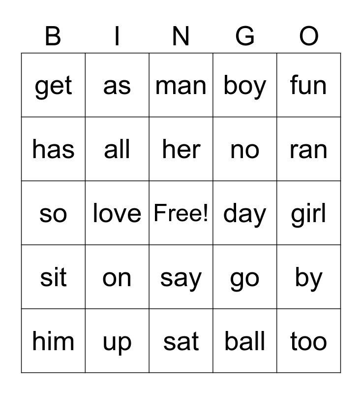 This bingo card has a free space and 24 words: on, up, her, him, fun, get, has, as, day, say, no, so, go, by, all, ball, girl, man, ran, love, too, sit, boy and sat.