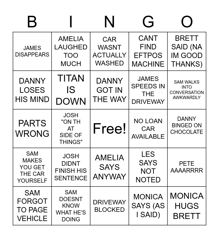 This bingo card has a free space and 24 words: SAM FORGOT TO PAGE VEHICLE, JOSH DIDNT FINISH HIS SENTENCE, DANNY GOT IN THE WAY, MONICA SAYS (AS I SAID), BRETT SAID (NA IM GOOD THANKS), JAMES DISAPPEARS, AMELIA LAUGHED TOO MUCH, CAR WASNT ACTUALLY WASHED, NO LOAN CAR AVAILABLE, DANNY BINGED ON CHOCOLATE, PARTS WRONG, TITAN IS DOWN, LES SAYS NOT NOTED, PETE AAAARRRR, DANNY LOSES HIS MIND, SAM DOESNT KNOW WHAT HE'S DOING, DRIVEWAY BLOCKED, CANT FIND EFTPOS MACHINE, SAM WALKS INTO CONVERSATION AWKWARDLY, SAM MAKES YOU GET THE CAR YOURSELF, JOSH "ON THAT SIDE OF THINGS", AMELIA SAYS ANYWAY, JAMES SPEEDS IN THE DRIVEWAY and MONICA HUGS BRETT.