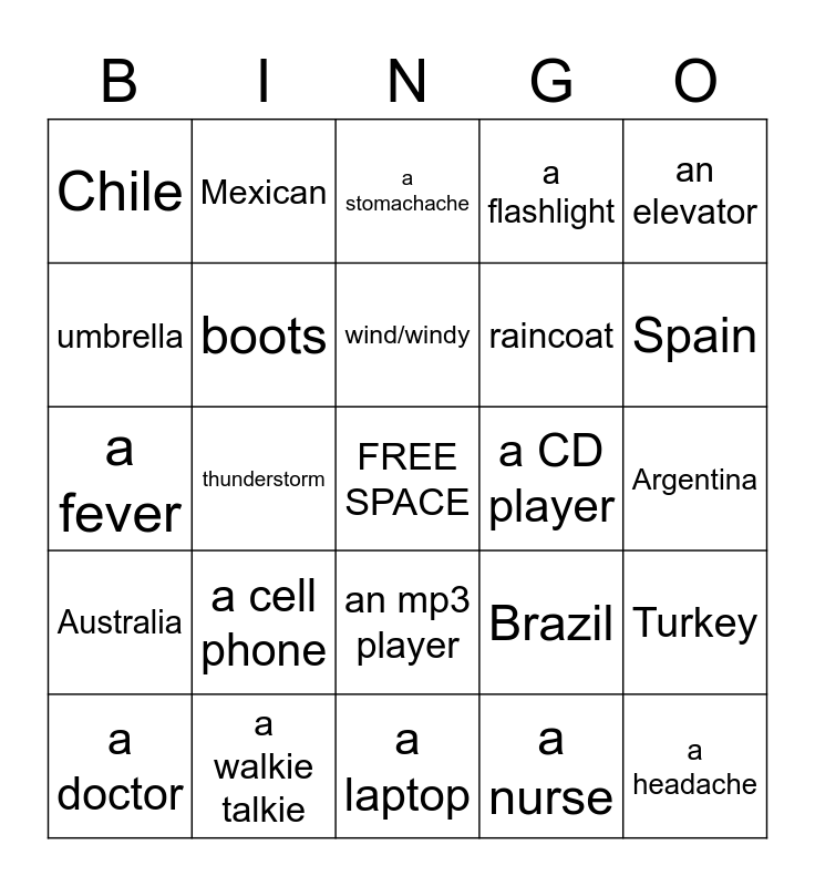 This bingo card has a free space and 44 words: an earache, a headache, a cold, a doctor, a toothache, a nurse, a stomachache, a cough, an elevator, a walkie talkie, a flashlight, a CD player, an mp3 player, a cell phone, an electric fan, a laptop, an electric toothbrush, a fever, Egypt, Spain, Mexican, Egyptian, Mexico, Chile, Spanish, Argentina, India, Indian, Brazil, Australia, Australian, Turkey, Turkish, Brazilian, thunderstorm, lightning, cloud/cloudy, rain/rainy, wind/windy, umbrella, raincoat, foggy, boots and transportation.