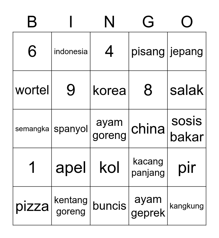This bingo card has a free space and 24 words: pizza, apel, korea, ayam geprek, jepang, 6, indonesia, 4, china, sosis bakar, semangka, 9, kacang panjang, pir, wortel, kentang goreng, buncis, pisang, salak, 1, spanyol, kol, 8 and kangkung.