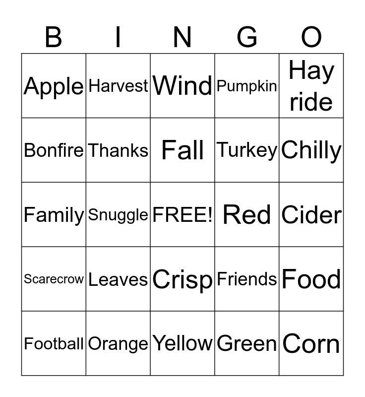 This bingo card has a free space and 24 words: Leaves, Orange, Fall, Football, Hay ride, Apple, Bonfire, Harvest, Red, Crisp, Turkey, Family, Friends, Food, Thanks, Green, Cider, Wind, Chilly, Snuggle, Corn, Scarecrow, Pumpkin and Yellow.