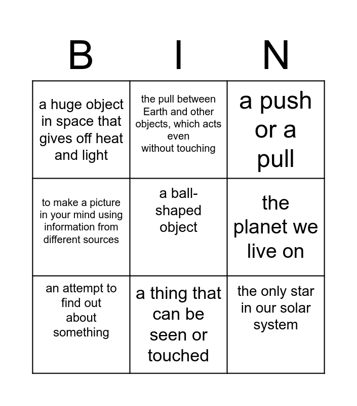 This bingo card has a free space and 8 words: the planet we live on, a push or a pull, the pull between Earth and other objects, which acts even without touching, an attempt to find out about something, a huge object in space that gives off heat and light, the only star in our solar system, to make a picture in your mind using information from different sources and a thing that can be seen or touched.