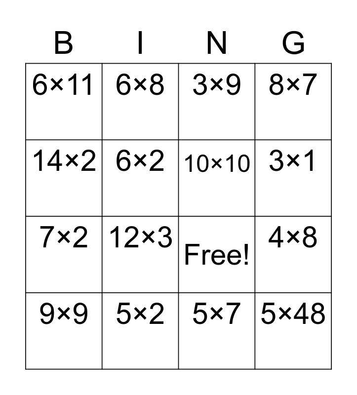 This bingo card has 16 words: 5×2, 4×8, 3×9, 6×11, 7×2, 6×8, Free!, 5×7, 14×2, 6×2, 9×9, 8×7, 12×3, 3×1, 10×10 and 5×48.