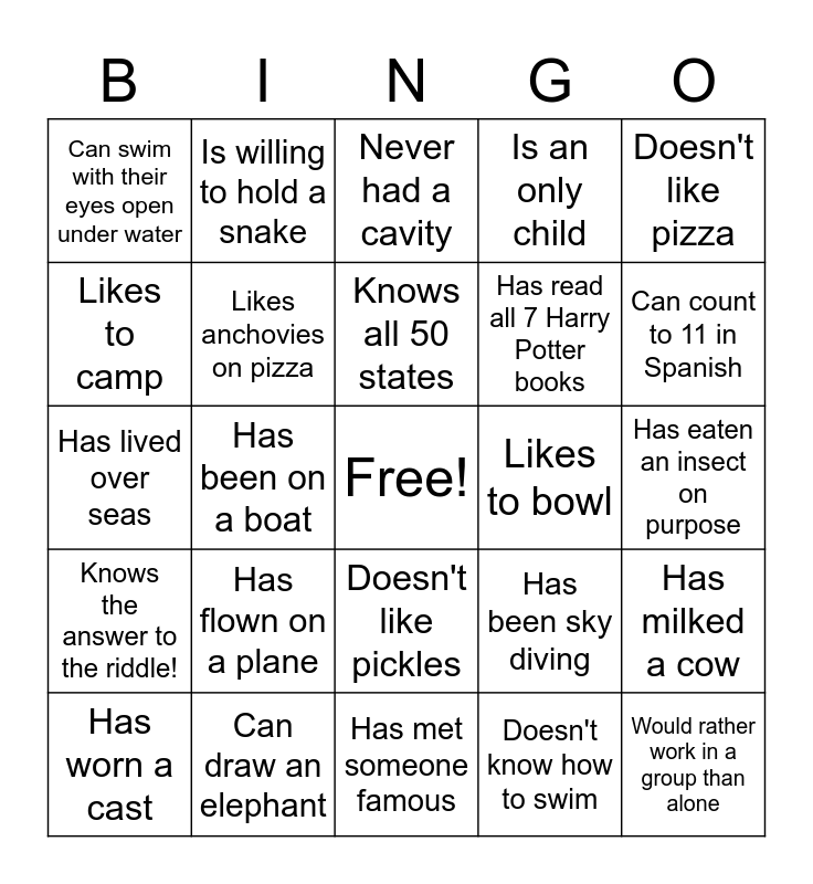 This bingo card has a free space and 24 words: Has flown on a plane, Can draw an elephant, Knows all 50 states, Has worn a cast, Doesn't like pizza, Can swim with their eyes open under water, Likes to camp, Is willing to hold a snake, Likes to bowl, Doesn't like pickles, Has read all 7 Harry Potter books, Has lived over seas, Has been sky diving, Has milked a cow, Likes anchovies on pizza, Doesn't know how to swim, Has eaten an insect on purpose, Never had a cavity, Can count to 11 in Spanish, Has been on a boat, Would rather work in a group than alone, Knows the answer to the riddle!, Is an only child and Has met someone famous.