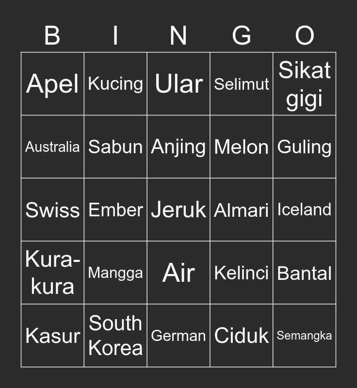 This bingo card has 25 words: Mangga, German, Anjing, Kasur, Sikat gigi, Apel, Australia, Kucing, Almari, Air, Melon, Swiss, Kelinci, Bantal, Sabun, Semangka, Iceland, Ular, Guling, Ember, Jeruk, South Korea, Kura-kura, Selimut and Ciduk.