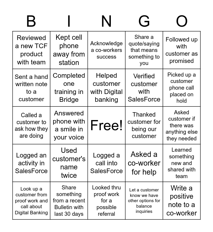 This bingo card has a free space and 24 words: Used customer's name twice, Share something from a recent Bulletin with last 30 days, Helped customer with Digital banking, Look up a customer from proof work and call about Digital Banking, Followed up with customer as promised, Reviewed a new TCF product with team, Sent a hand written note to a customer, Kept cell phone away from station, Thanked customer for being our customer, Logged a call into SalesForce, Verified customer with SalesForce, Called a customer to ask how they are doing, Asked a co-worker for help, Learned something new and shared with team, Completed one training in Bridge, Let a customer know we have other options for balance inquiries, Asked customer if there was anything else they needed, Acknowledge a co-workers success, Picked up a customer phone call placed on hold, Answered phone with a smile in your voice, Write a positive note to a co-worker, Logged an activity in SalesForce, Share a quote/saying that means something to you and Looked thru proof work for a possible referral.