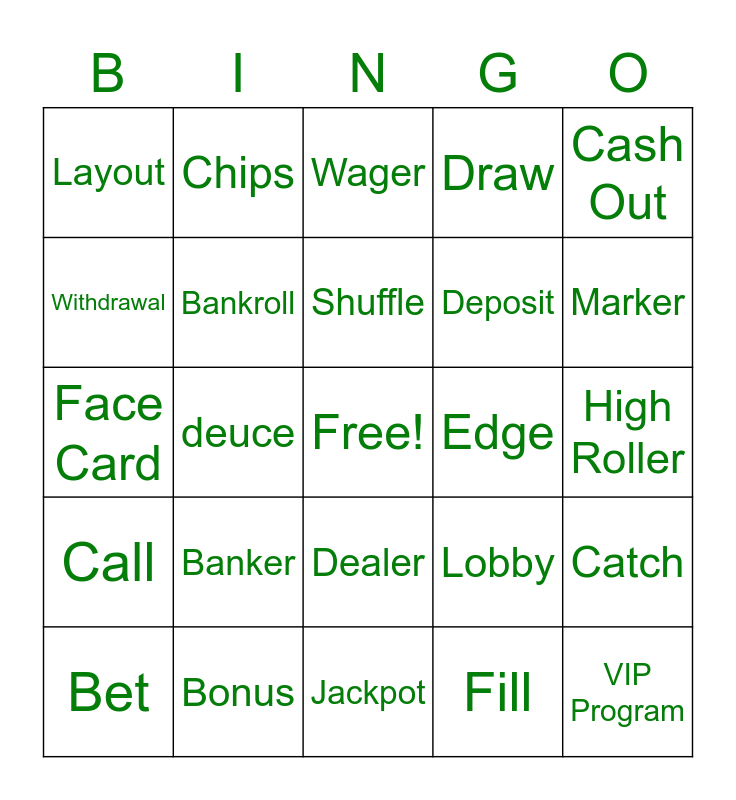 This bingo card has a free space and 25 words: Banker, Jackpot, Shuffle, Bet, Cash Out, Layout, Withdrawal, Chips, Edge, Dealer, Deposit, Face Card, Lobby, Catch, Bankroll, House, High Roller, Wager, Marker, deuce, VIP Program, Bonus, Call, Draw and Fill.