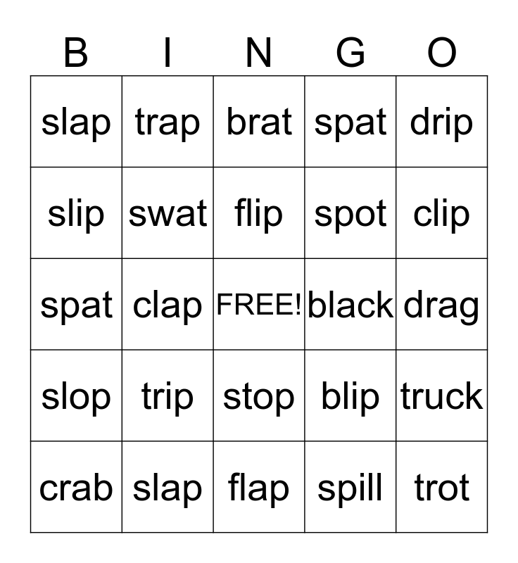 This bingo card has a free space and 25 words: trip, flap, flip, crab, drip, slap, slip, trap, black, stop, spot, spat, blip, truck, swat, drop, drag, brat, clip, clap, trot, slap, slop, spat and spill.