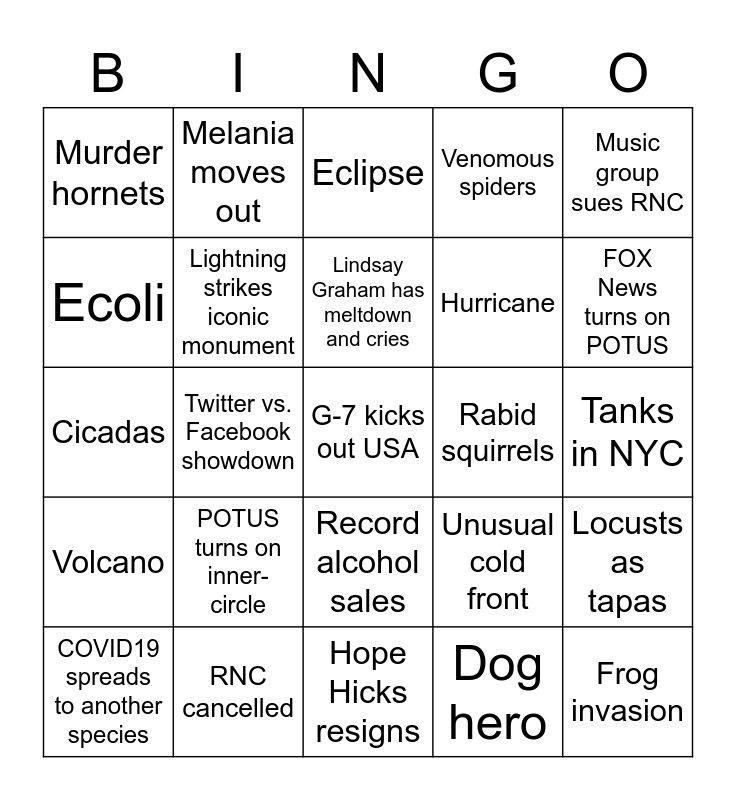 This bingo card has 25 words: POTUS turns on inner-circle, Hope Hicks resigns, Lindsay Graham has meltdown and cries, COVID19 spreads to another species, Music group sues RNC, Murder hornets, Ecoli, Melania moves out, Rabid squirrels, Record alcohol sales, Hurricane, Cicadas, Unusual cold front, Locusts as tapas, Lightning strikes iconic monument, Frog invasion, Tanks in NYC, Eclipse, FOX News turns on POTUS, Twitter vs. Facebook showdown, G-7 kicks out USA, RNC cancelled, Volcano, Venomous spiders and Dog hero.