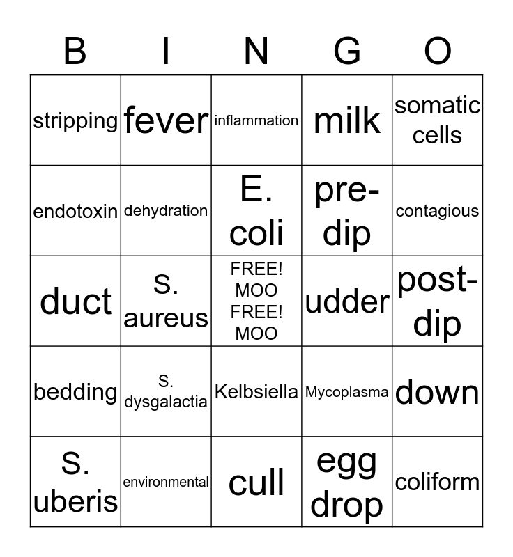 This bingo card has a free space and 24 words: S. dysgalactia, environmental, E. coli, S. uberis, somatic cells, stripping, endotoxin, fever, udder, Kelbsiella, pre-dip, duct, Mycoplasma, down, dehydration, egg drop, post-dip, inflammation, contagious, S. aureus, coliform, bedding, milk and cull.